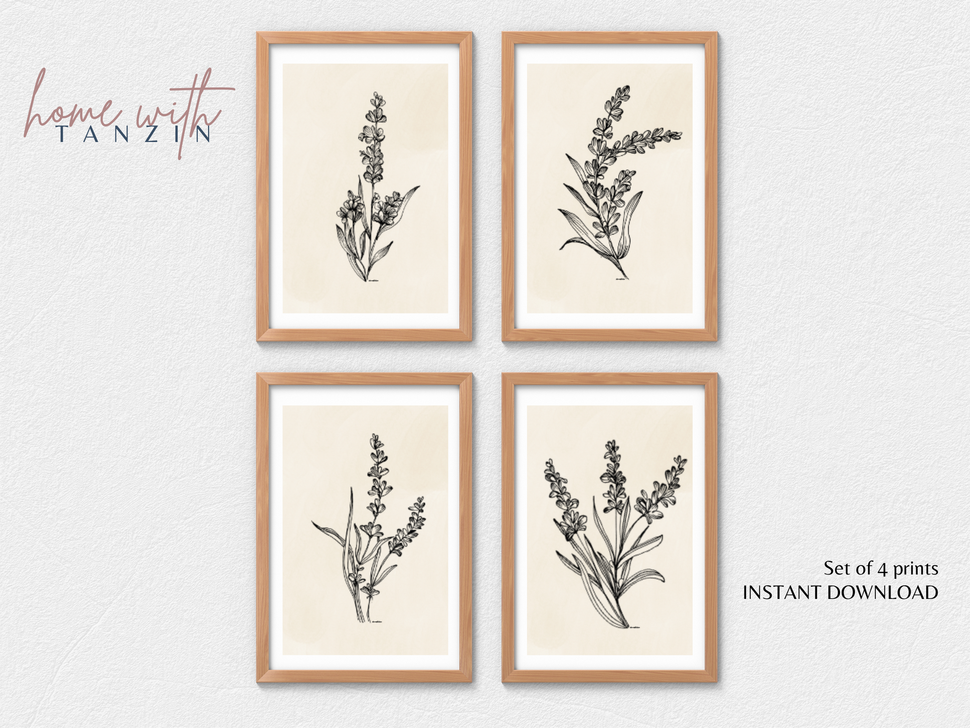 Vintage Floral Art Print - Soft Beige - Set of 4